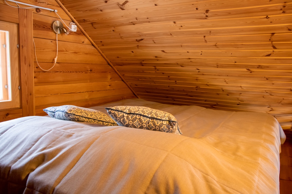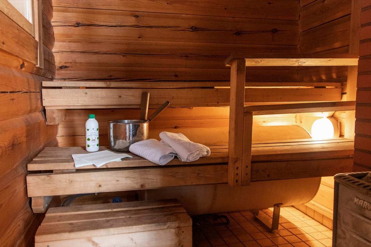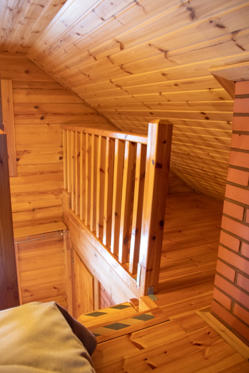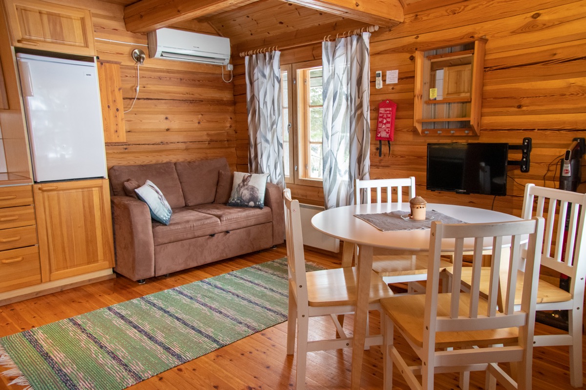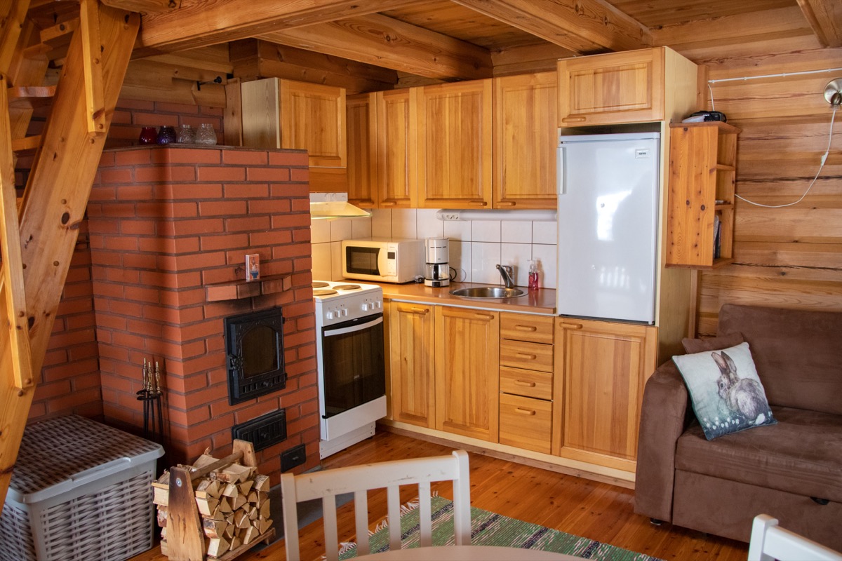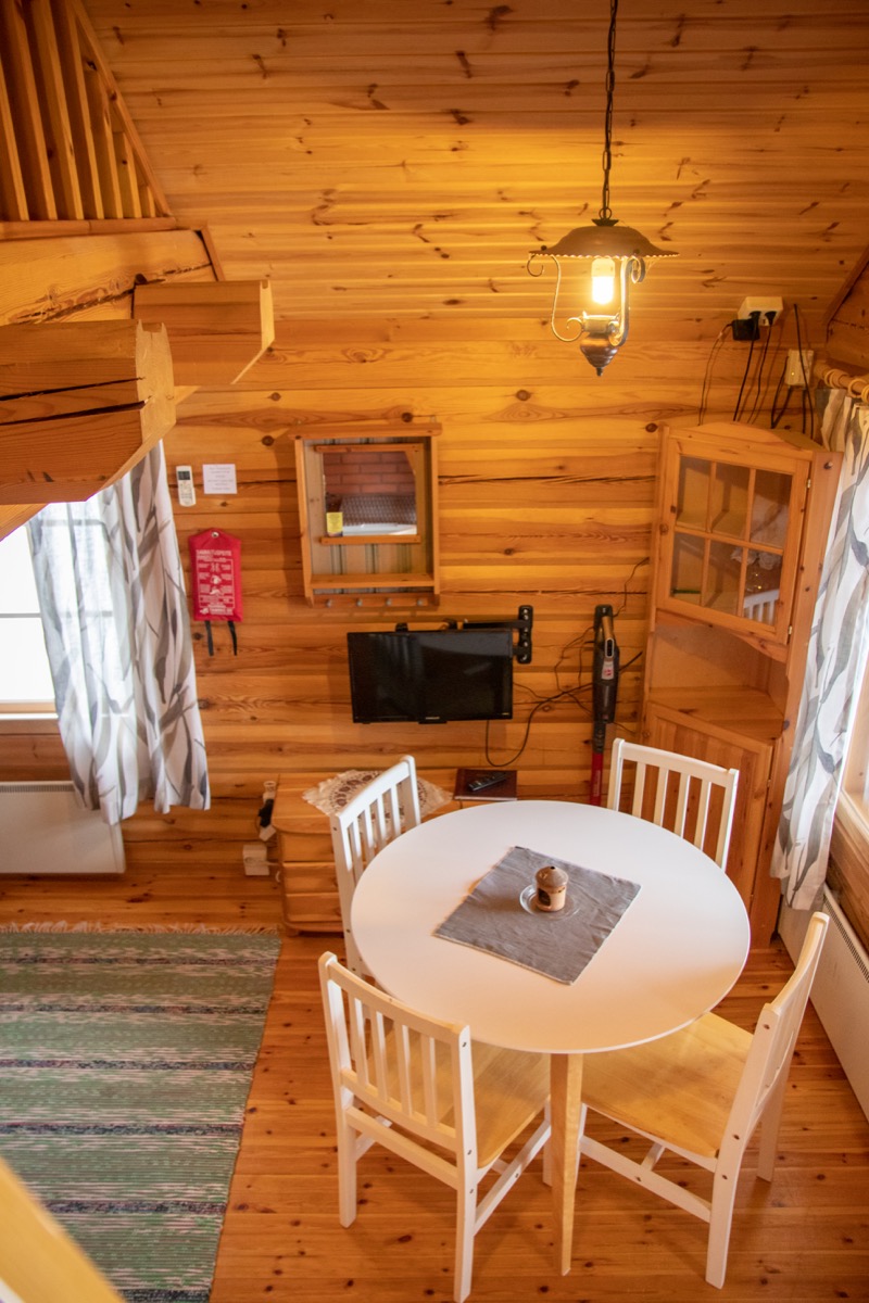 Pikkutuvan alakerrassa oleskelu/ruokailutila, jossa tupakeittiö, sekä vuodesohva. Alakerrassa myös sauna ja suihkutila, jossa on wc. Avoparvella 2 runkopatjasänkyä. Parven rappuset ovat jyrkät!!