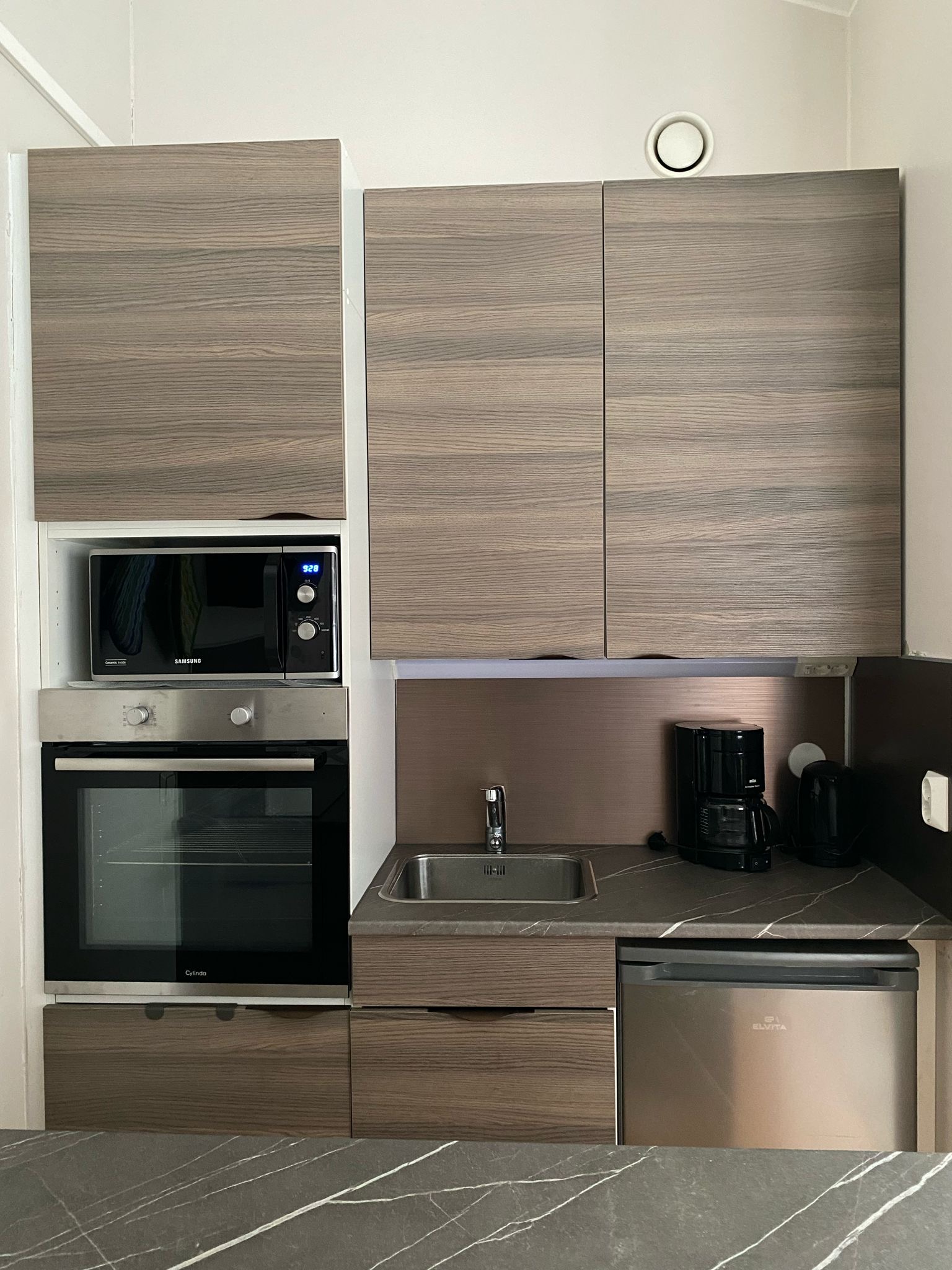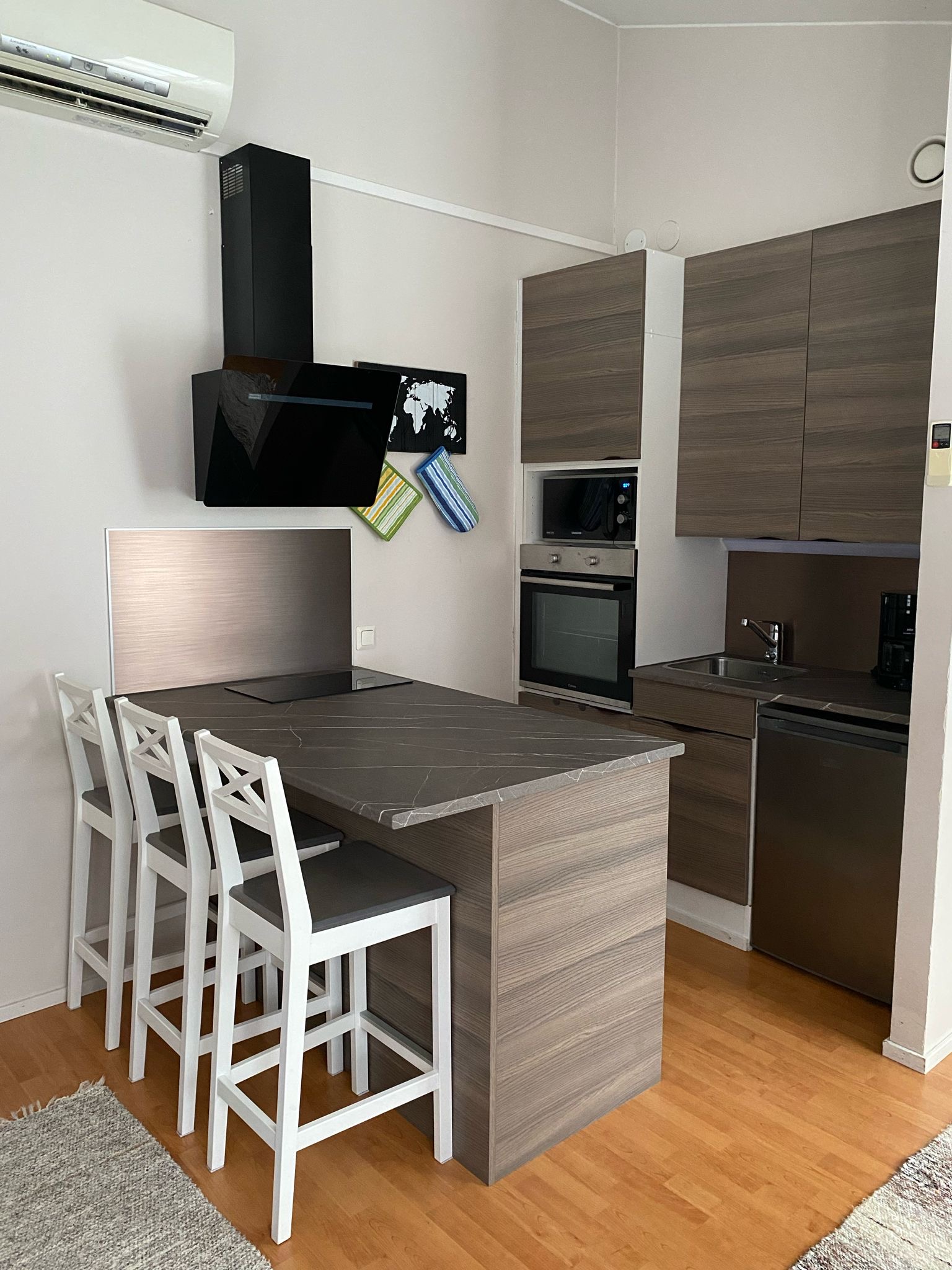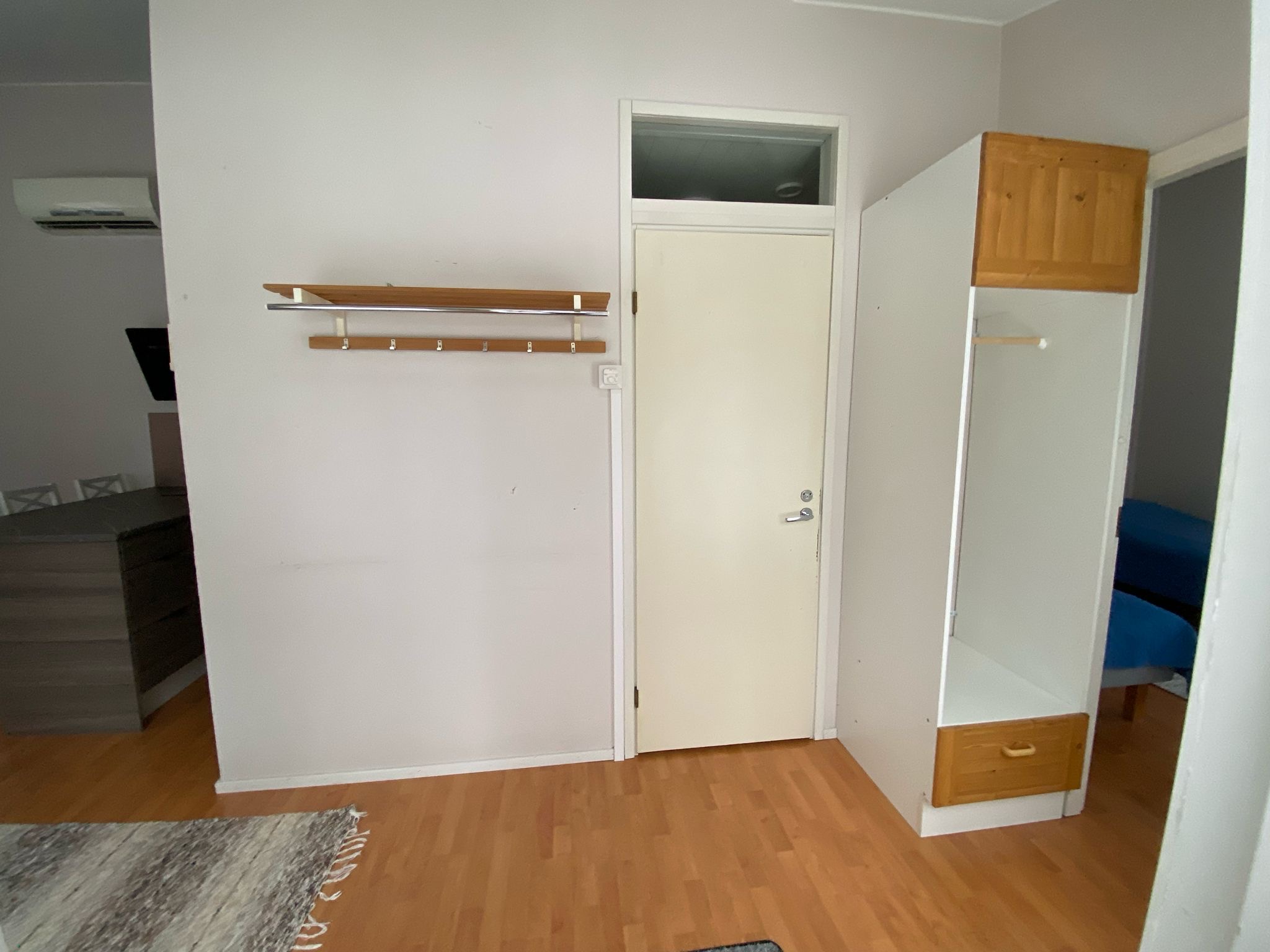 - Keittiö: jääkaappi pienellä pakastinlokerolla, kaksi keittolevyä, liesituuletin, uuni, mikro, kahvinkeitin, vedenkeitin, leivänpaahdin