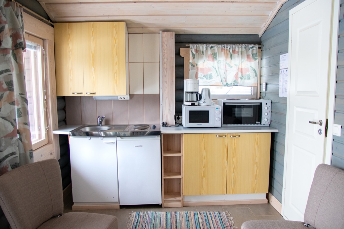 - Keittiö: minikeittiö, jossa on jääkaappi pienellä pakastinlokerolla, kaksi keittolevyä, mikro, kahvinkeitin, vedenkeitin, pieni erillinen uuni