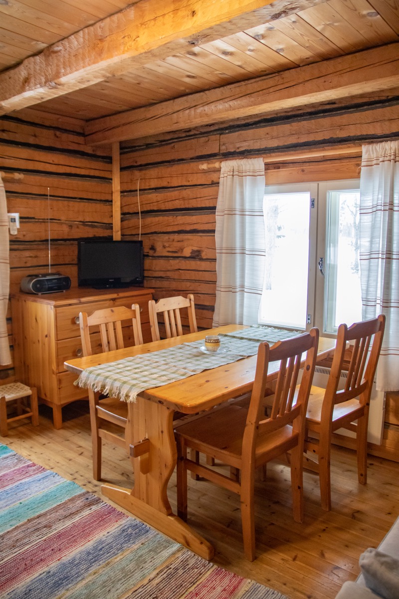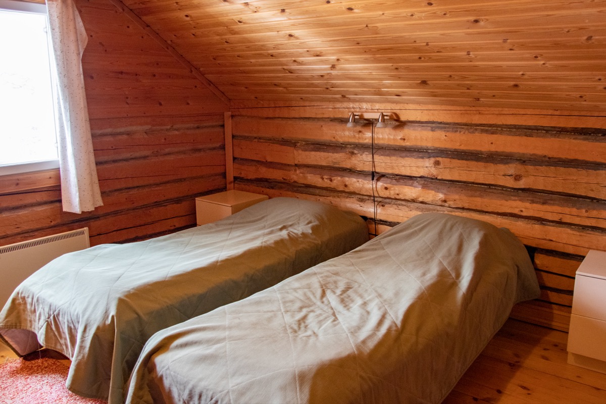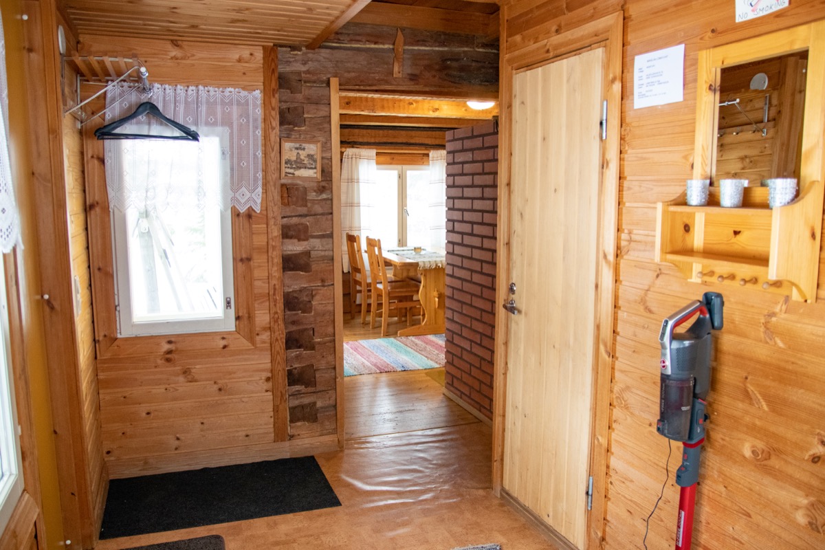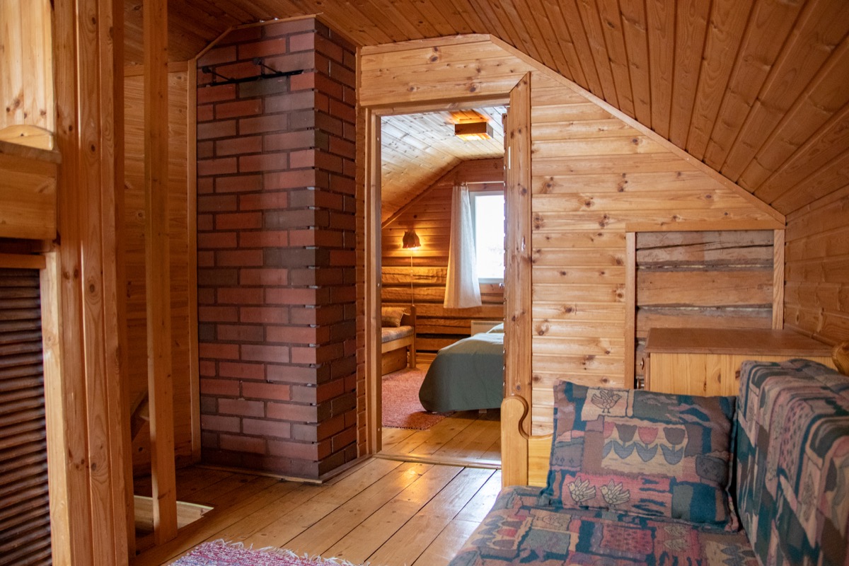 Mökin alakerrassa yhdistetty tupakeittiö/olohuone, wc, sauna sekä tilava pesuhuone. Yläkerran aulassa levitettävä vuodesohva sekä erillinen makuuhuone kahdella sängyllä. Makuuhuoneessa vaatekomero ja vuodesohva.