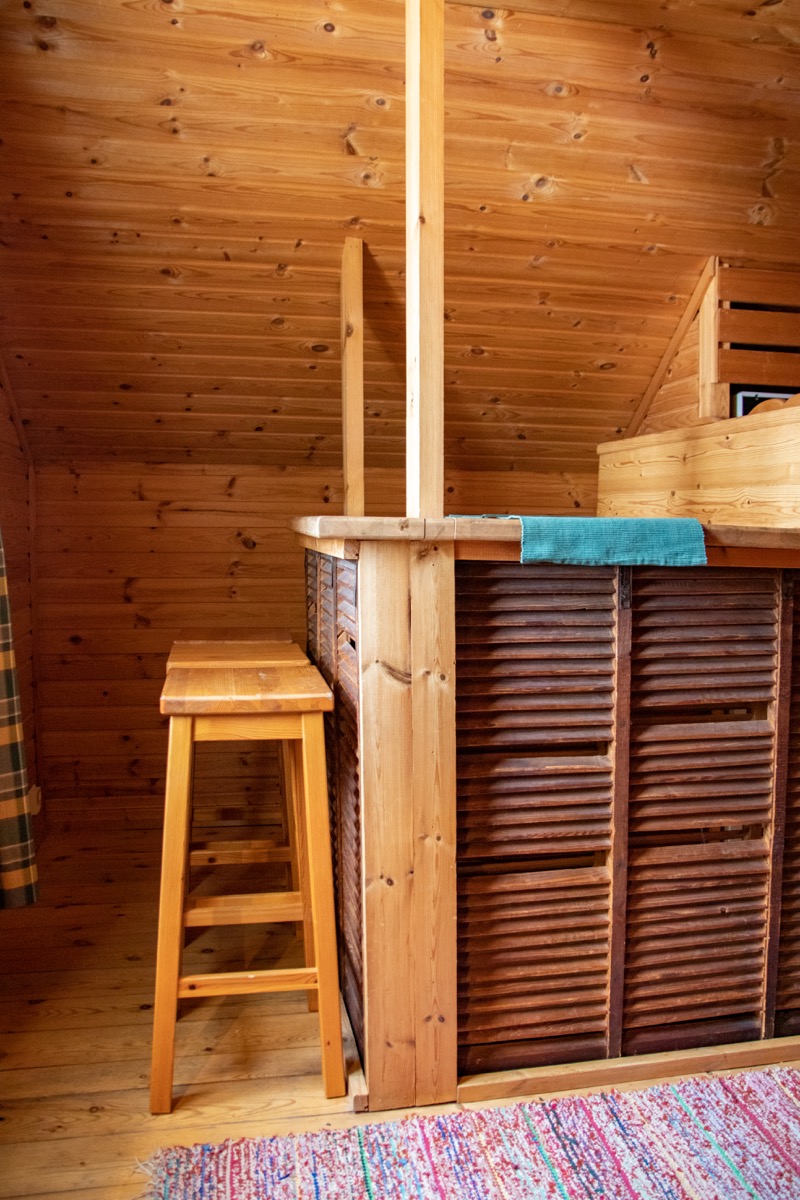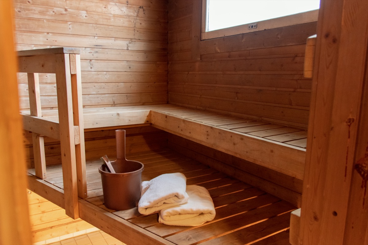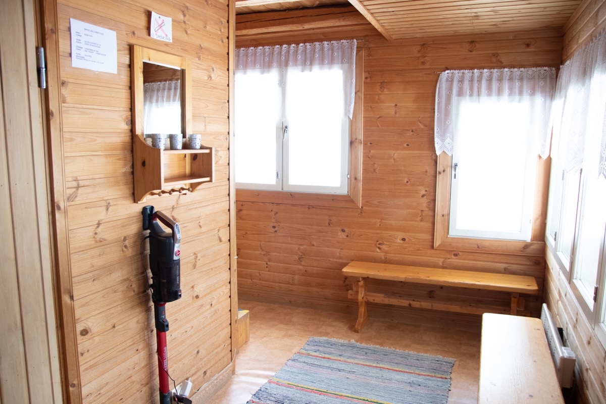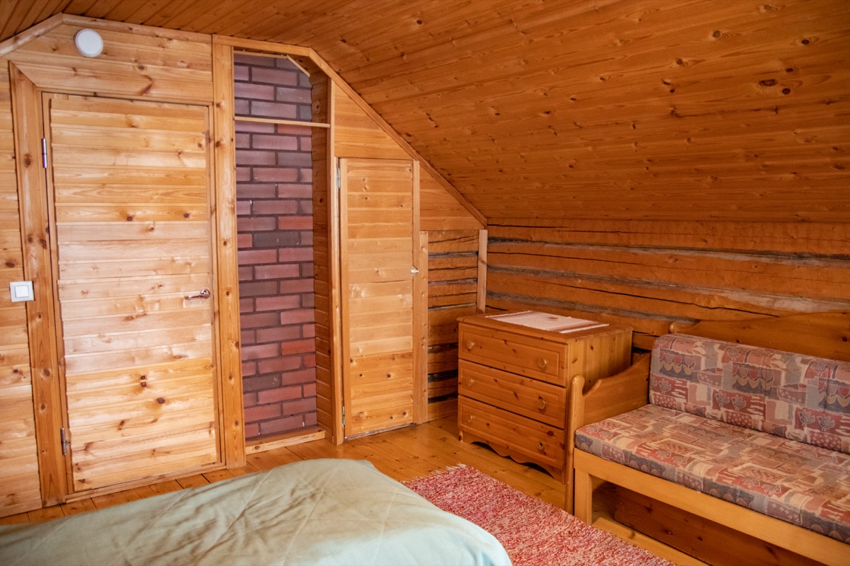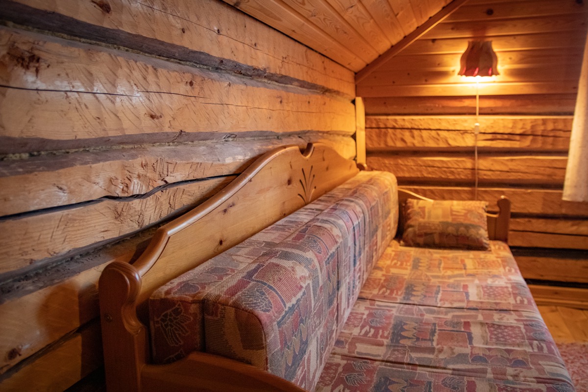 Mökin alakerrassa yhdistetty tupakeittiö/olohuone, wc, sauna sekä tilava pesuhuone. Yläkerran aulassa levitettävä vuodesohva sekä erillinen makuuhuone kahdella sängyllä. Makuuhuoneessa vaatekomero ja vuodesohva.