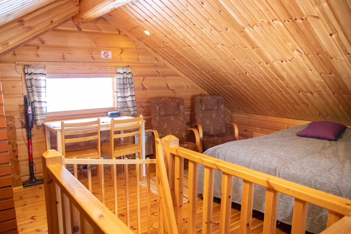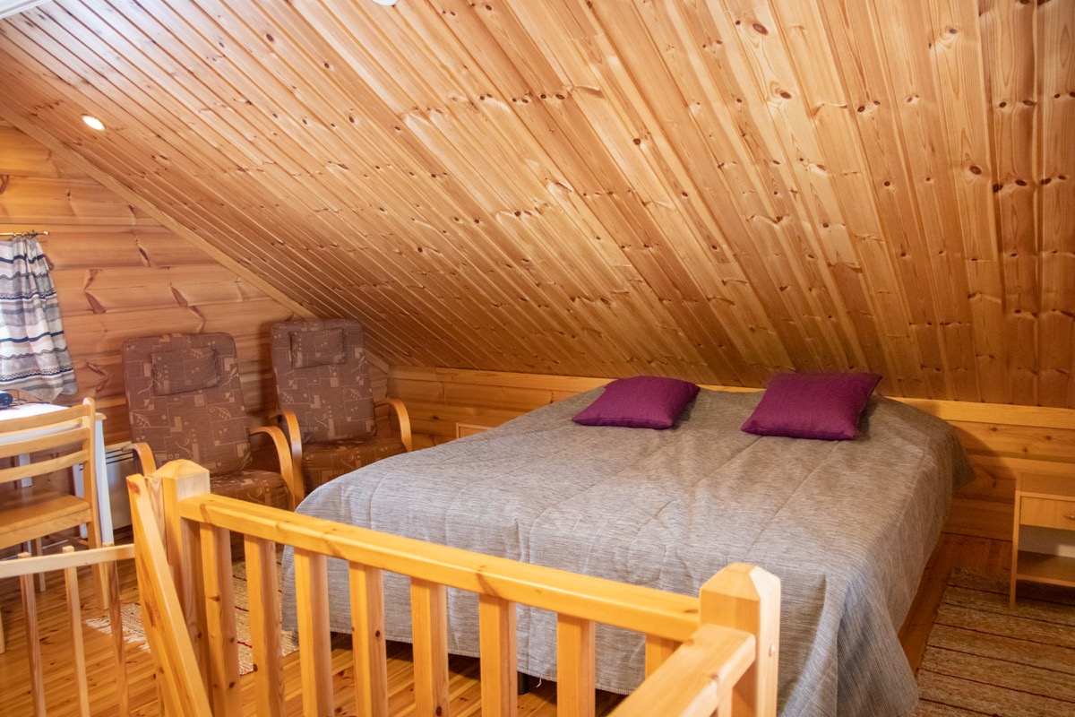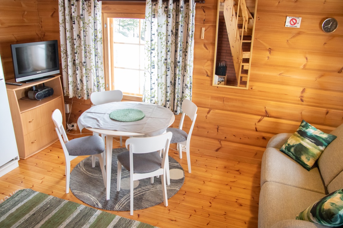 Mökin alakerrassa oleskelutila, jossa tupakeittiö. Alakerrassa sijaitsee myös pesuhuone, jossa suihku ja wc, sekä puulämmitteinen sauna. Yläkerta on yhtenäistä tilaa, jossa on pieni komero. Sänkyjä yläkerrassa on kolme (2x80cm ja 1x120cm leveitä) ja alakerrassa yksi vuodesohva.