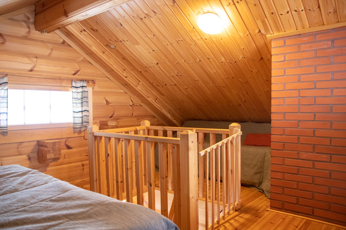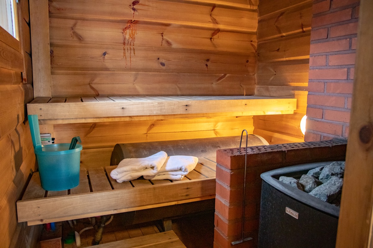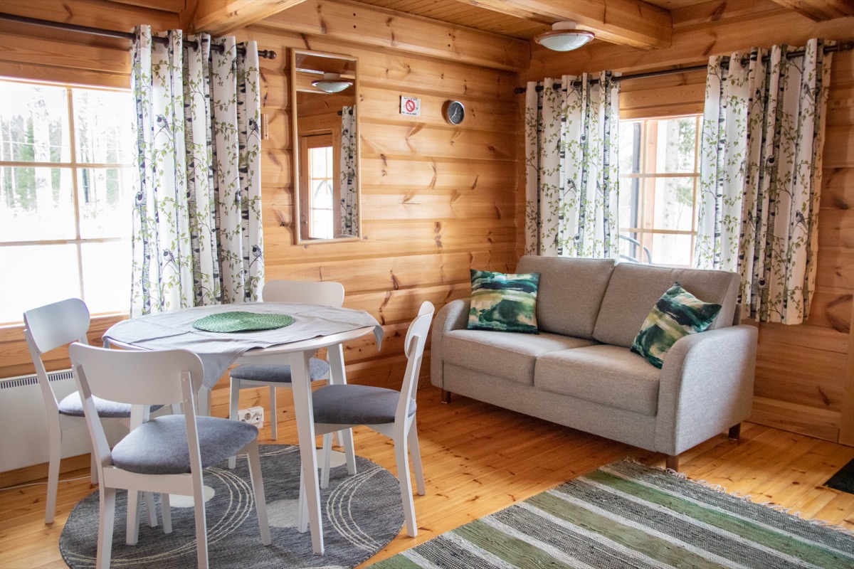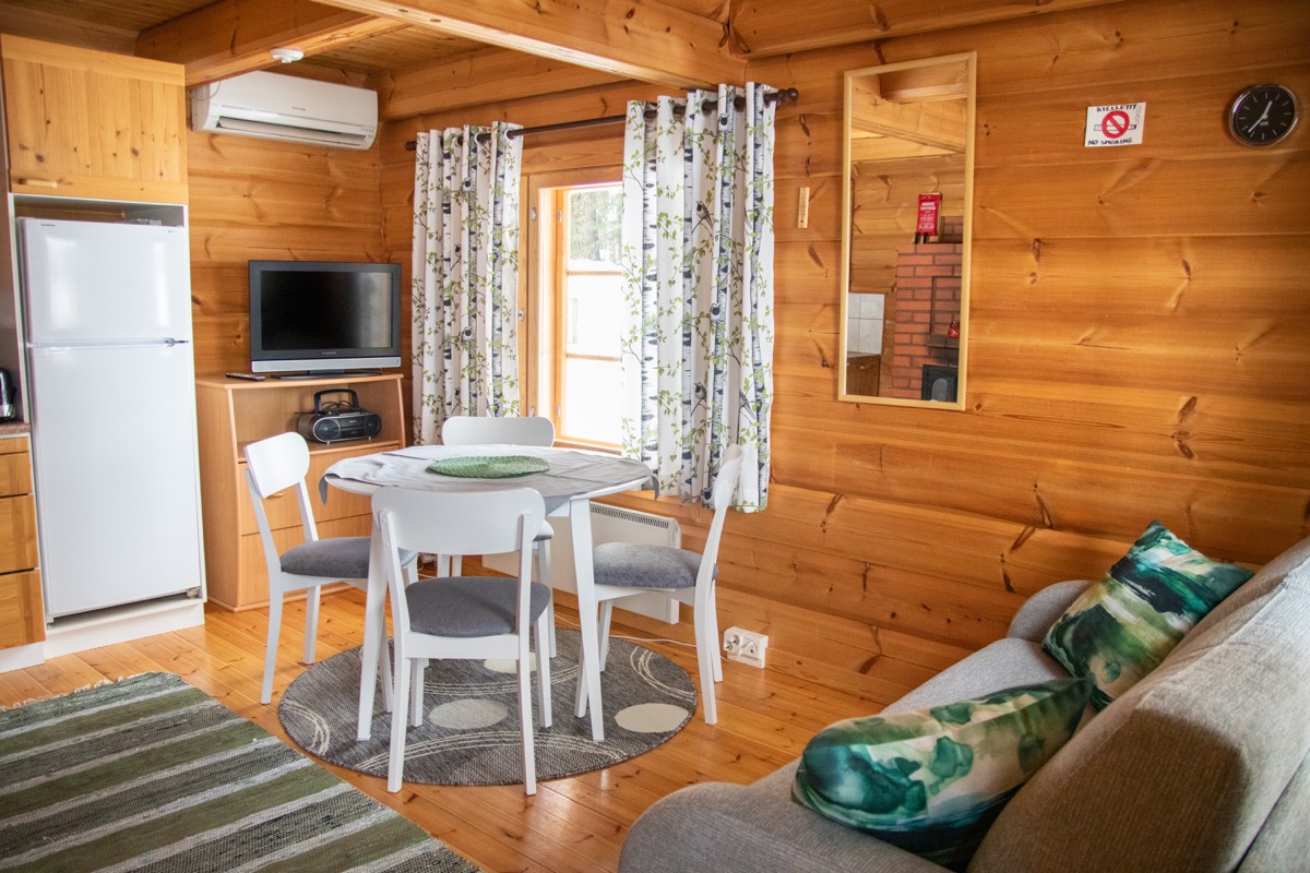 Mökin alakerrassa oleskelutila, jossa tupakeittiö. Alakerrassa sijaitsee myös pesuhuone, jossa suihku ja wc, sekä puulämmitteinen sauna. Yläkerta on yhtenäistä tilaa, jossa on pieni komero. Sänkyjä yläkerrassa on kolme (2x80cm ja 1x120cm leveitä) ja alakerrassa yksi vuodesohva.