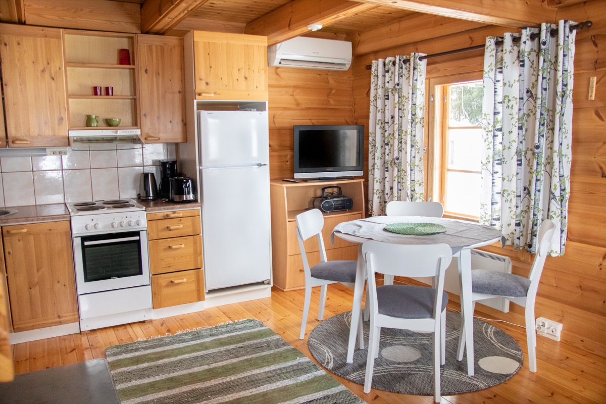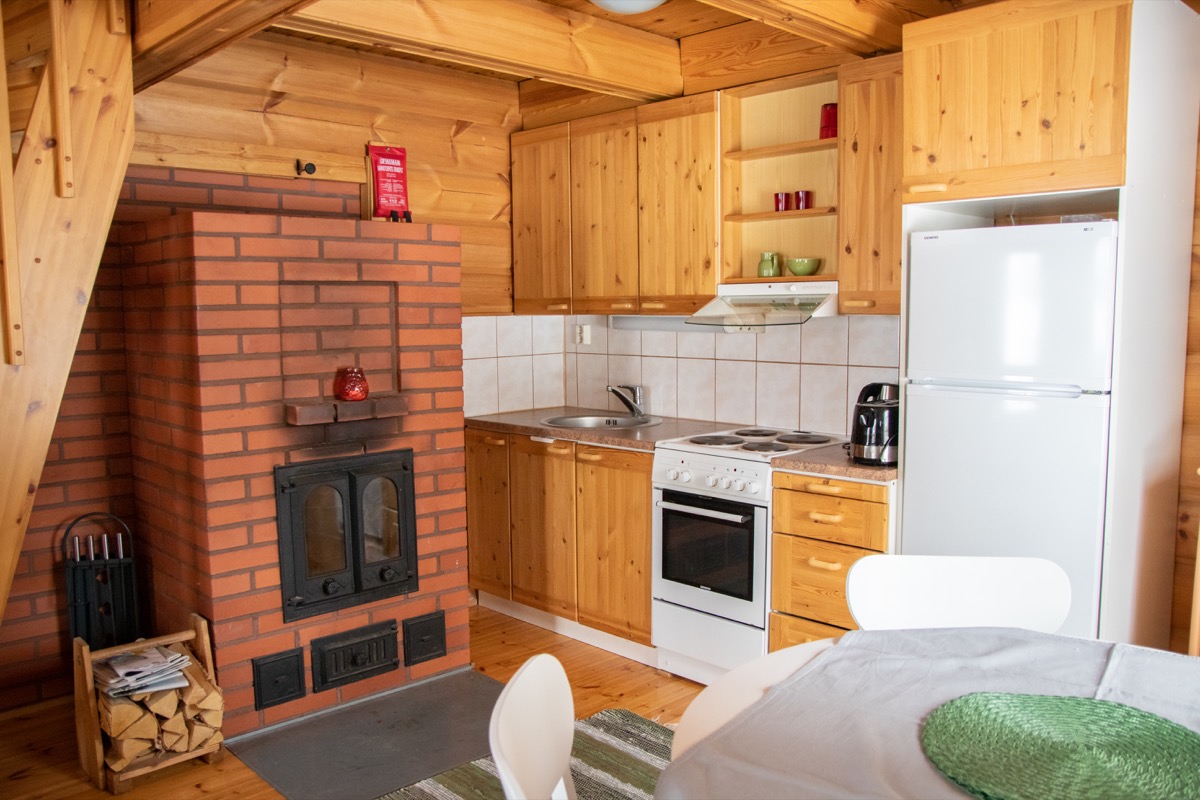 • keittiö: Jääkaappi, jossa pieni erillinen pakastin, sähköliesi uunilla, liesituuletin, mikro, kahvinkeitin, vedenkeitin, leivänpaahdin